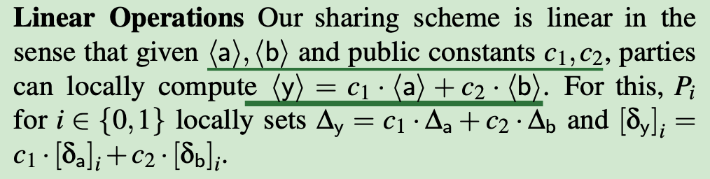 Parties can locally compute ⟨y⟩=c1⋅⟨a⟩+c2⋅⟨b⟩