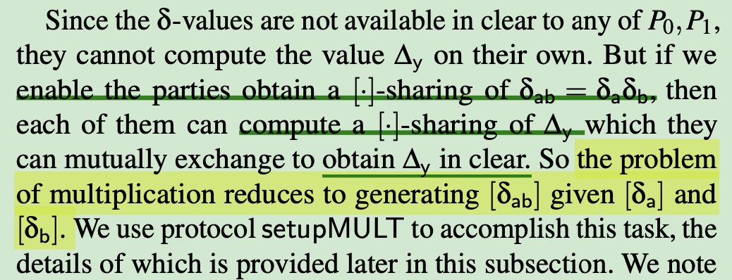 They can compute a []-sharing of Δyif the parties obtain [·]-sharing of δab=δaδb