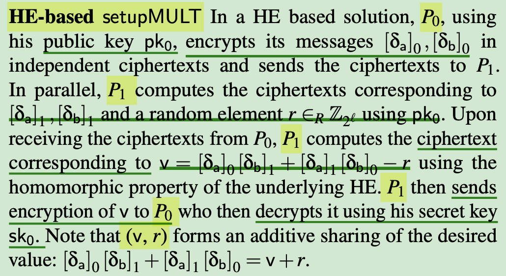 P1: computes ciphertext correspnding to v: v=[δ2]0[δb]1+[δa]1[δb]0−r (HE)