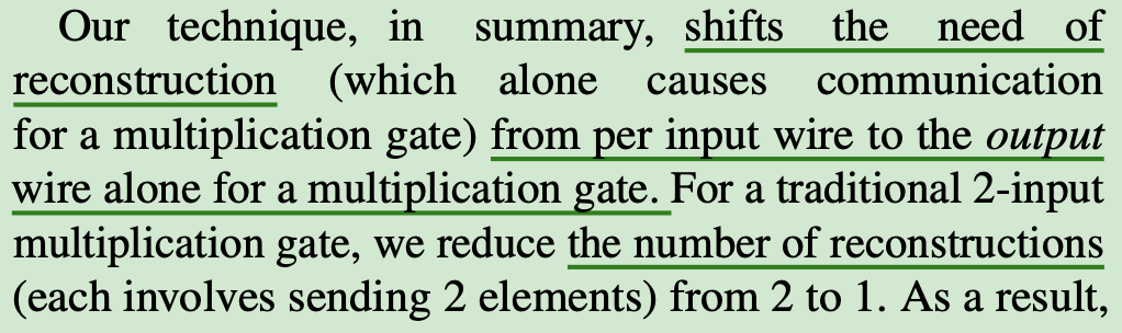 requires communicating 4 elements per multiplication(2 elements per reconstruction)